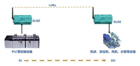 一对 XL60 无线采集装置 ,一台与 PLC 等控制仪表连接,作信号发射端;一台配置在生产现场,作信号接收端。发射端的 XL60 将控制仪表的启停命令,通过 LoRa 无线对传到接收端,接收端的 XL60 输出开关量信号,控制设备启、停。